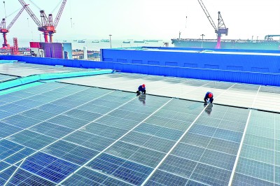 1月18日,浙江省首个“不拆瓦”BIPV(光伏建筑一体化)屋顶光伏项目——舟山市万邦船舶重工有限公司(二期)分布式光伏正式投运。图为电力工人在项目现场查看并网投运情况。姚峰摄/光明图片