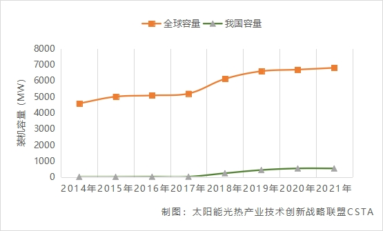 图:2014~2021年全球太阳能热发电累计装机容量发展情况