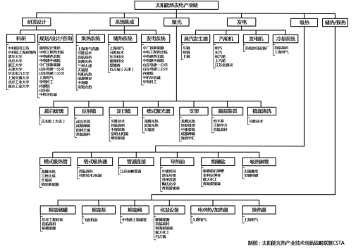 图:我国太阳能热发电产业链的主要环节及代表性企事业单位