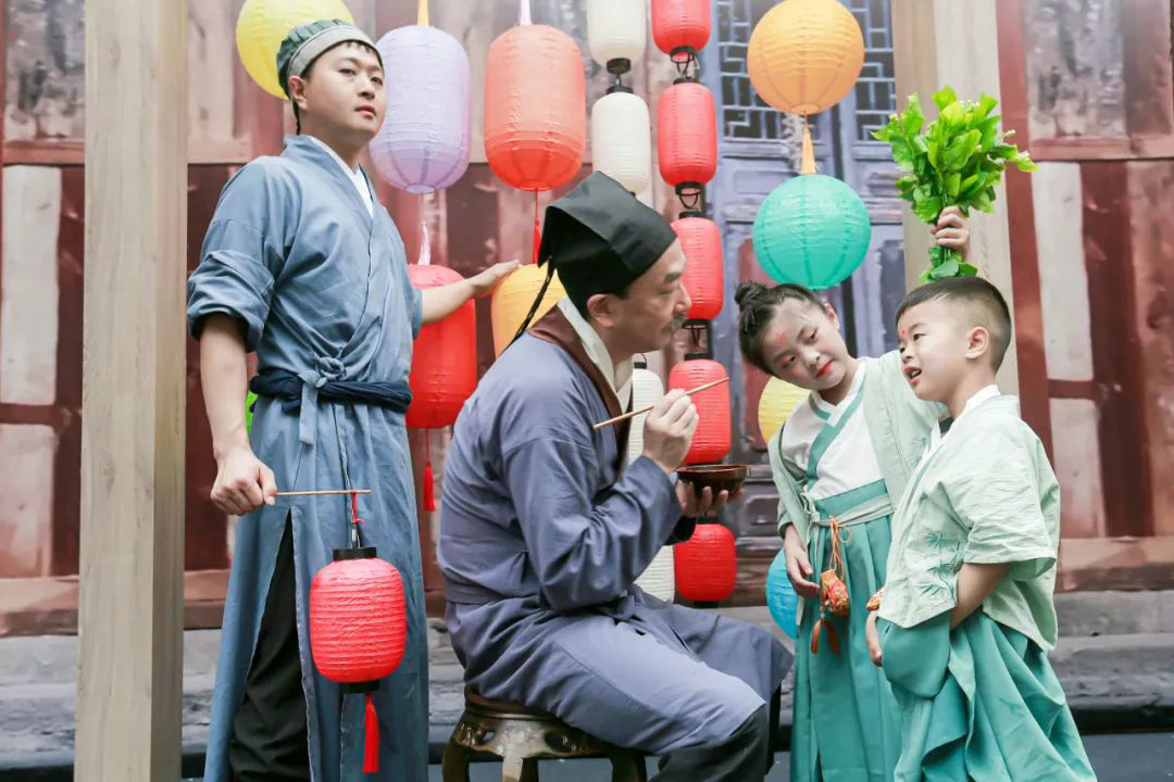 佩戴着麦穗徽章的领导嘉宾们从礼乐大道出发,大道两旁,24面立鼓、24面幡旗和24副长号次第延伸,分别展示了“天时、物候、忠贤、家国”和传统二十四节气名称。尽头处,琵琶、古筝演奏,尽显国风之美;麦穗含风秀满田,一曲诗朗诵,描述了小麦成就传世茅台佳酿的历程;市井烟火,演绎了茅台古镇端午熙攘景象;曲酒问世,以情景表演形式,将茅台酒酿造工艺还原再现。
