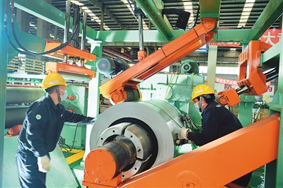 位于江苏省太仓港经济技术开发区的五矿邯钢(苏州)钢材加工有限公司内,生产技术人员正在加工销往市场的钢材产品。 计海新摄(人民视觉)