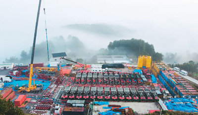 近日,位于四川盆地的綦江页岩气田勘探开发取得突破,首期探明地质储量1459.68亿立方米通过自然资源部专家组审定,是中国又一个超千亿立方米的大型整装页岩气田。图为綦江页岩气田丁页7井大型压裂施工现场。 黄 勇摄