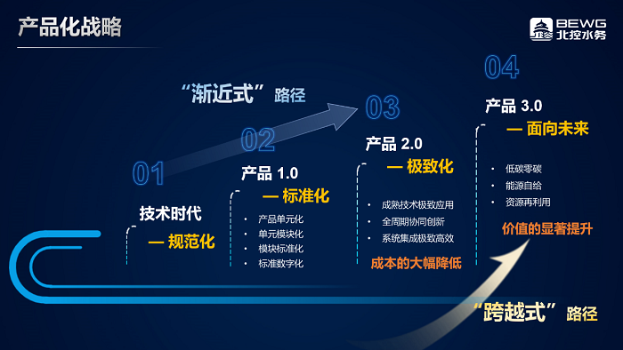 北控水务的产品化战略正在从1.0升级至2.0时代,力求成熟技术极致应用、全周期协同创新、系统集成极致高效,实现成本大幅降低。在未来产品3.0时代将更加依靠新技术应用和跨领域融合,举行业之力实现低碳零碳、能源自给、资源再利用的产业生态化。