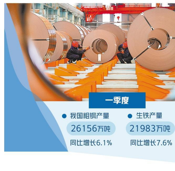 一季度我国钢铁行业运行特点显示,钢铁产量同比上升,市场需求有所改善。据国家统计局公布的数据,一季度,我国粗钢产量26156万吨,同比增长6.1%;生铁产量21983万吨,同比增长7.6%;钢材产量33259万吨,同比增长5.8%。一季度,折合粗钢表观消费量为24342万吨,同比增长1.9%;重点企业各月钢材库存均高于去年同期,供给强度高于消费增长。