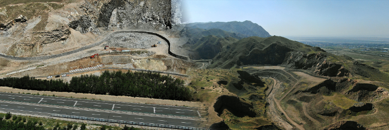 光大环境杭州九峰垃圾焚烧发电项目(左)所在的山谷原本是位于杭州市余杭区中泰街道一个废弃的矿坑(右),占地面积约14公顷。