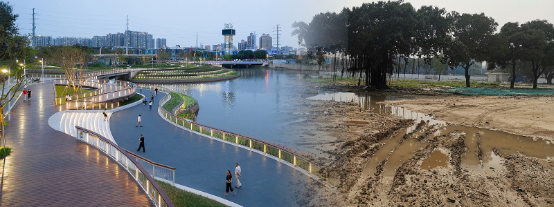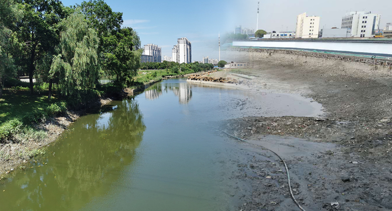 无锡市苏屑河在2020年3月治理前,河底沉积严重,河水呈黑绿色。2020年10月,中国二十冶实施清淤工程(左),通过打造雨水花园,使水质得到提升,环境得到改变,成为市民休闲锻炼的好去处。(右)