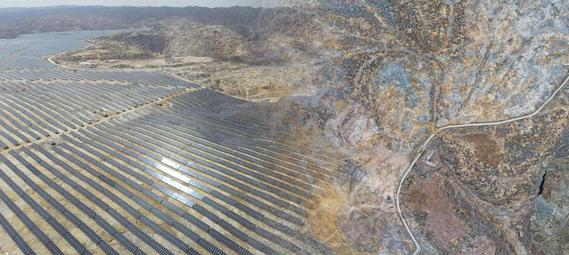 甘肃省白银深部铜矿废石场是一座尾矿(右),中核集团旗下中国核电投资控股的中核汇能与兰州大学创新深入合作开展白银深部铜矿废石场治理项目,在铜矿废石场上建设光伏电站(左),合理利用土地资源的同时,覆盖铺设的光伏板还能有效降低水分蒸发量、减少地表水下渗,对后期板下植草绿化、恢复矿区生态环境创造有利条件。