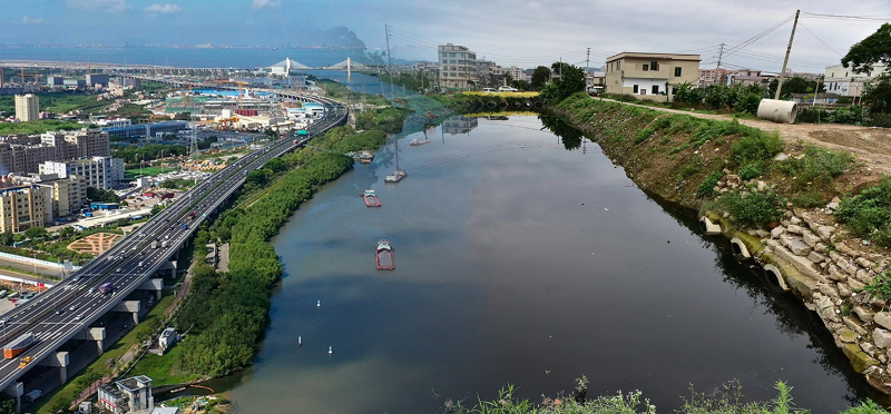 粤东练江一度成为广东省污染最严重的河流之一(右)。2019年1月1日起,练江流域243家印染企业全部停产;2019年12月,中信环境潮南印染产业园建成投运。