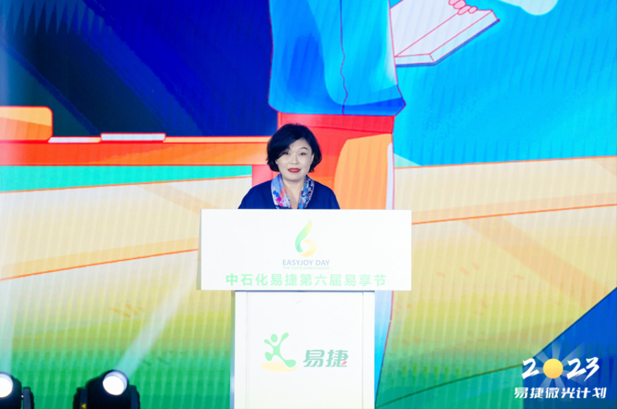 中国石化销售股份有限公司总经理、党委副书记李玉杏和奥运冠军、易捷公益大使张宁和五位乡村教师代表