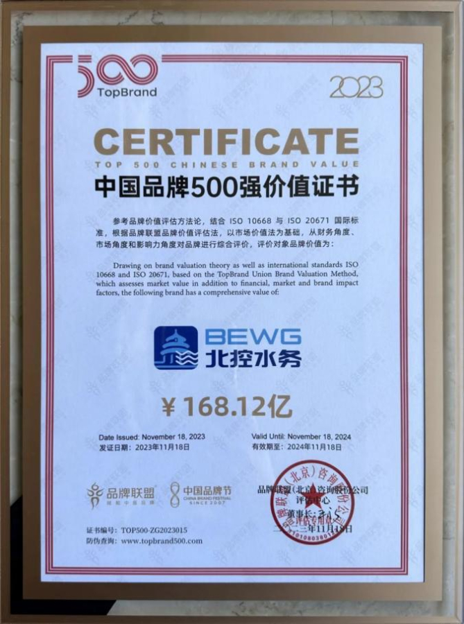 11月18日,2023第十七届中国品牌节在杭州举行。品牌联盟(Topbrand Union)发布了《TopBrand 2023 中国品牌500强》榜单。北控水务获中国品牌500强荣誉称号,品牌价值达到168.12亿元,这是北控水务连续两年入选该榜单。