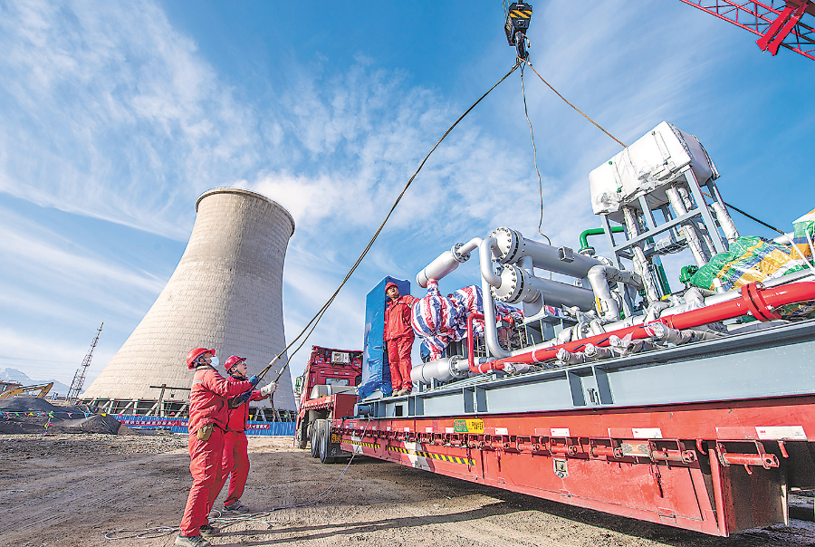 中国石油玉门油田员工在可再生能源制氢示范项目现场吊装氢气压缩机。朱俊霖 摄