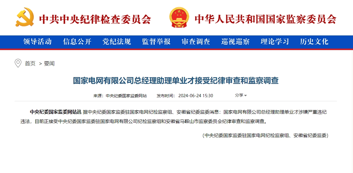 据中央纪委国家监委驻国家电网纪检监察组、安徽省纪委监委消息:国家电网有限公司总经理助理单业才涉嫌严重违纪违法,目前正接受中央纪委国家监委驻国家电网有限公司纪检监察组和安徽省马鞍山市监察委员会纪律审查和监察调查。