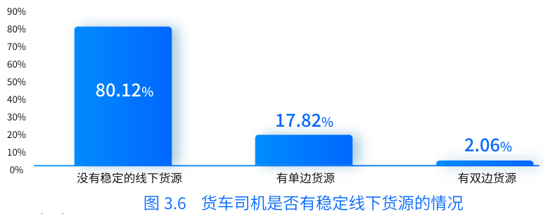 报告中提到,约80.12%的司机没有稳定的线下货源供应,货车司机很少能够掌握稳定线下货源。大部分司机面临货运工作的不稳定性,需要花费大量时间和精力去寻找和获取货源,这不仅降低了他们的运输效率,也增加了运营成本。