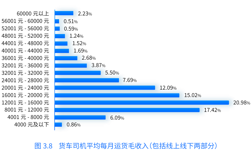 报告中提到,货车司机每月毛收入平均值为20441元。在剔除油(电、气)费、高速费、保险、保养和平台信息技术服务费等成本后,货车司机平均月净收入均值为12063元。