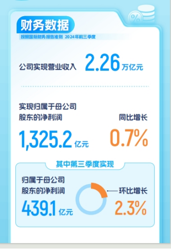 按照国际财务报告准则,2024年前三季度,公司实现营业收入2.26万亿元(人民币,下同),实现归属于母公司股东的净利润1,325.2亿元,同比增长0.7%,其中第三季度实现归属于母公司股东的净利润439.1亿元,环比增长2.3%。公司财务状况稳健良好,资产负债结构进一步优化,资产负债率39.5%,比年初下降1.3个百分点,为近十四年同期最低水平。