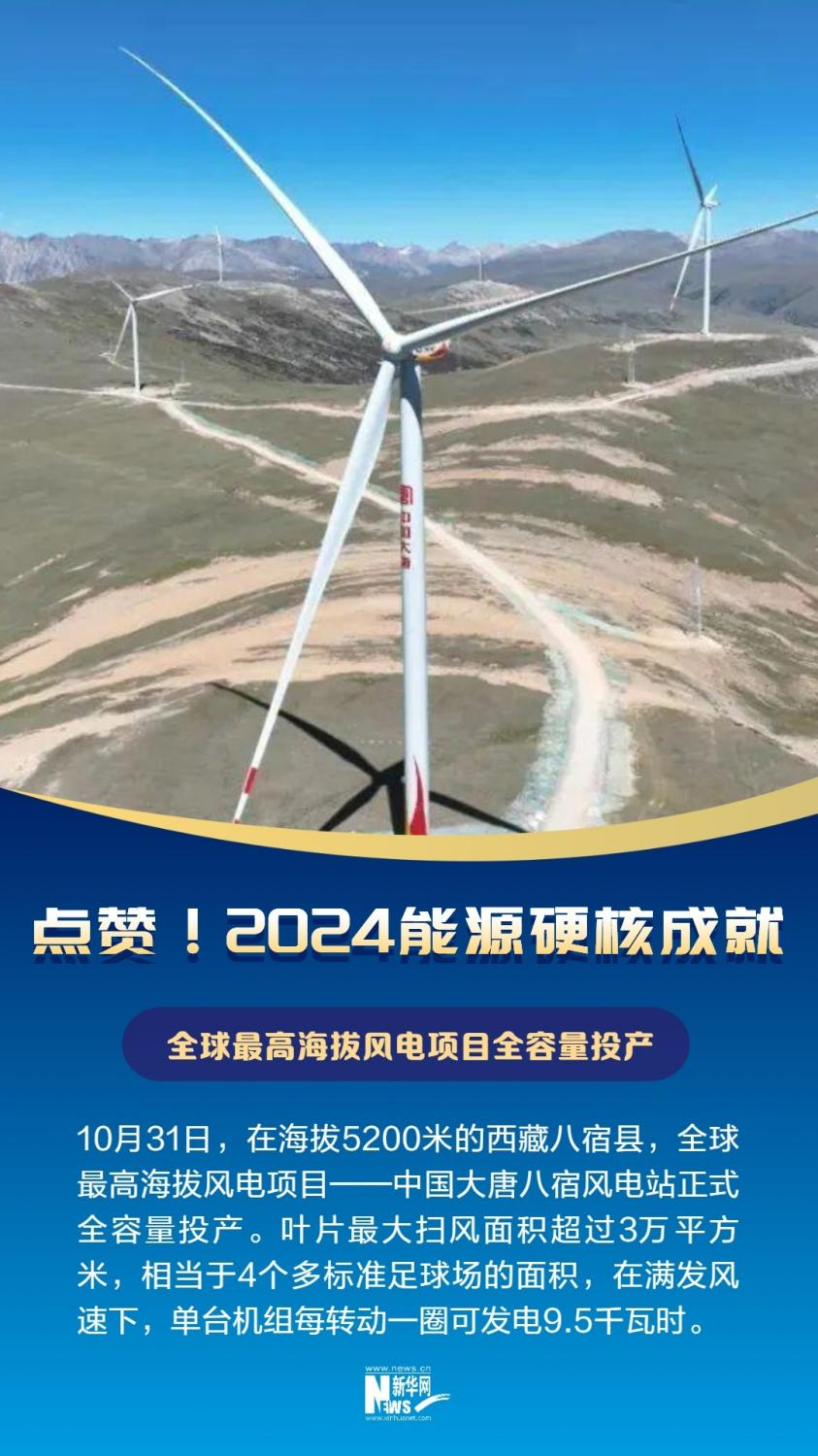 10月31日,在海拔5200米的西藏昌都市八宿县,全球最高海拔风电项目——中国大唐八宿风电站正式全容量投产。项目共安装20台风电机组,风机轮毂中心高度110米,叶轮直径195米,叶片最大扫风面积超过3万平方米,相当于4个多标准足球场的面积,在满发风速下,单台机组每转动一圈可发电9.5千瓦时。