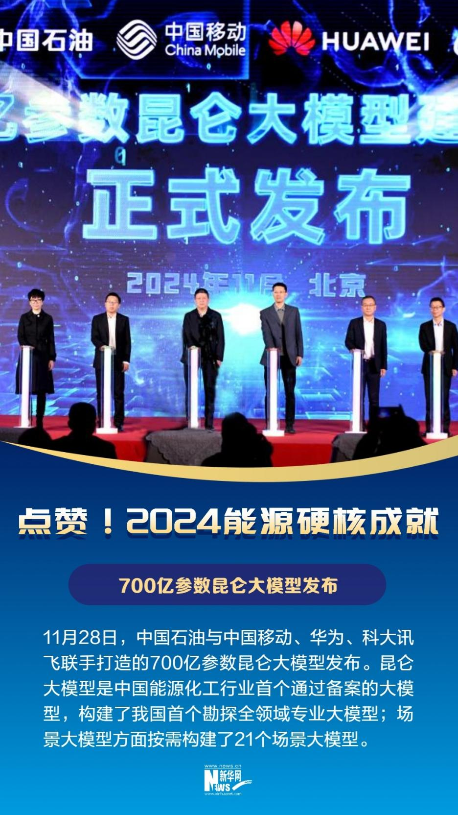 11月28日,中国石油与中国移动、华为、科大讯飞联手打造的700亿参数昆仑大模型发布。昆仑大模型是中国能源化工行业首个通过备案的大模型,于2024年5月正式启动建设,3个月后参数量级达到330亿。此次发布的昆仑大模型,在行业大模型方面参数从330亿升级到700亿,自然语言处理、语音视觉识别、多模态交互、科学计算等专业能力大幅提升,视觉大模型训练数据进一步丰富;在专业大模型方面构建了我国首个勘探全领域专业大模型;场景大模型方面按需构建了21个场景大模型。