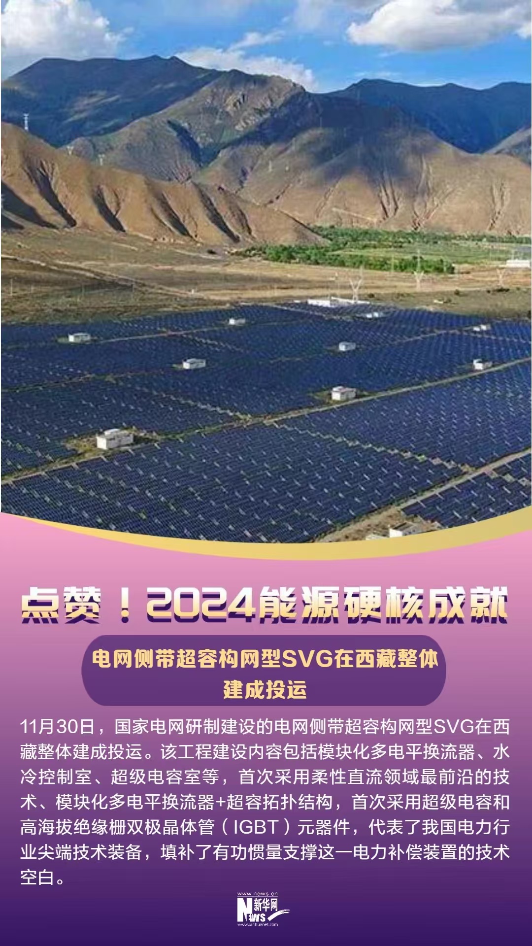 11月30日,国家电网研制建设的电网侧带超容构网型SVG在西藏整体建成投运。该工程建设内容包括模块化多电平换流器、水冷控制室、超级电容室等,首次采用柔性直流领域最前沿的技术、模块化多电平换流器+超容拓扑结构,首次采用超级电容和高海拔绝缘栅双极晶体管(IGBT)元器件,代表了我国电力行业尖端技术装备,填补了有功惯量支撑这一电力补偿装置的技术空白。