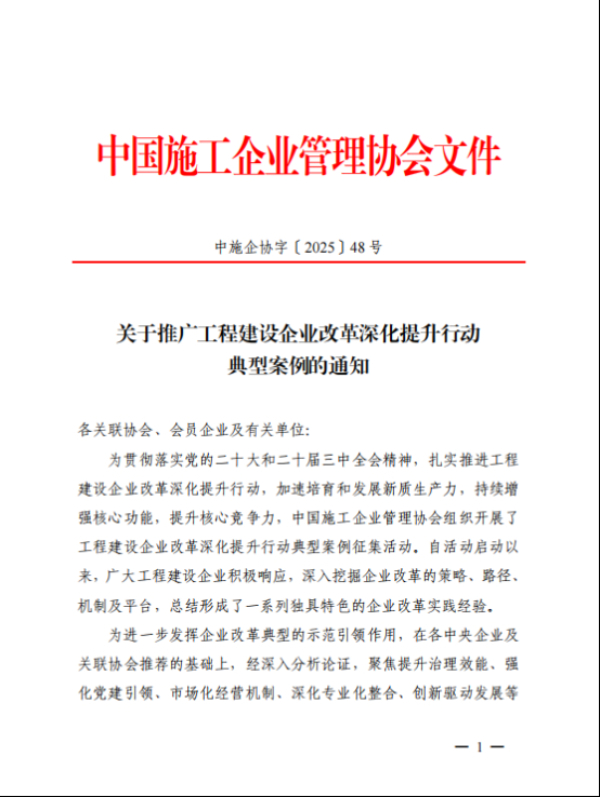 为扎实推进工程建设企业改革深化提升行动,加速培育和发展新质生产力,持续增强核心功能,提升核心竞争力,中国施工企业管理协会组织开展工程建设企业改革深化提升行动典型案例征集活动。评审组经深入分析论证,围绕提升治理效能、强化党建引领、市场化经营机制、深化专业化整合、创新驱动发展等重点领域,在全国工程建设企业中精选出10项代表性突出、创新亮点显著、推广价值高的典型案例。