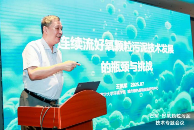 北控水务首席科学家、清华大学教授王凯军作《连续流好氧颗粒污泥技术发展的瓶颈与挑战》主旨报告。他认为,连续流AGS需突破反应器设计、微生物培养及智能运行三大难关,其发展依赖跨学科理论创新与工程化验证。