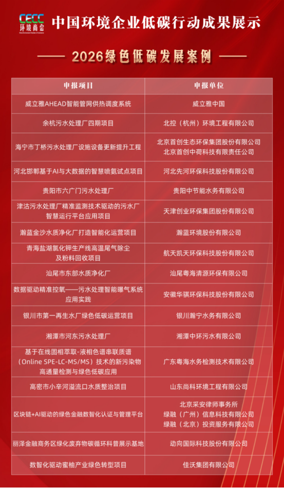 今年,为进一步培育生态环境领域新质生产力,推广先进经验,商会组织开展“2026绿色低碳发展案例”征集工作,经筹备、申报、审核等程序,最终遴选出第二批17个绿色低碳案例。