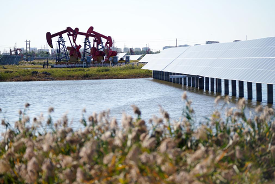 在大庆油田星火水面光伏电站拍摄的电站设施与附近的抽油机。 新华社记者 王建威 摄