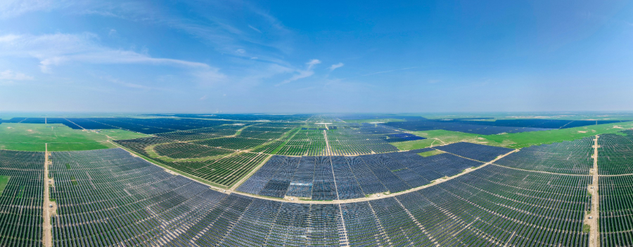 在鄂尔多斯的沙戈荒地带,国电电力蒙西蓝海光伏电站格外醒目。10.5万亩的土地上,光伏板向阳而立,板下紫花苜蓿、沙打旺等耐旱植物蓬勃生长。