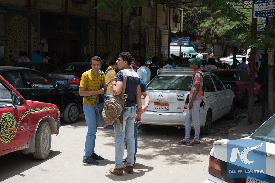 Egyptian students pose outside high school exam site in Cairo on June 13, 2016. (Xinhua/Meng Tao)