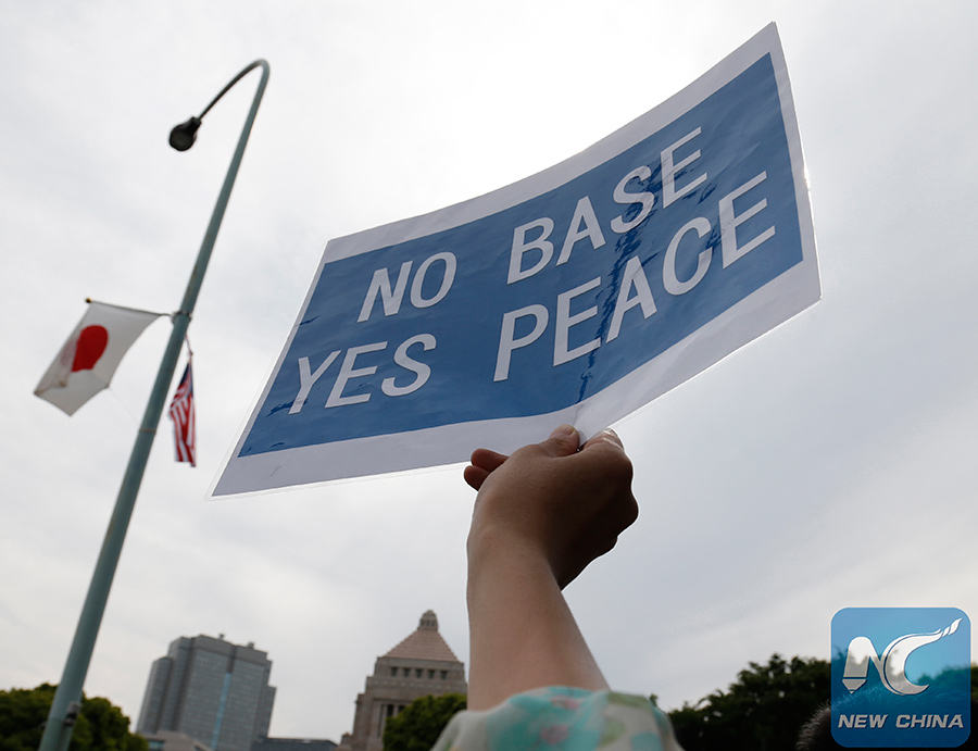 Photo taken on May 24, 2015 shows a banner held by a woman during a demonstration in front of the Diet (parliament) building in Tokyo, Japan. (Xinhua/Stringer) |