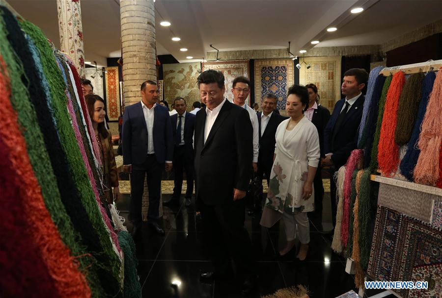 BUKHARA, June 21, 2016 (Xinhua) -- Chinese President Xi Jinping (C,front) and his wife Peng Liyuan visit a carpet and silk workshop in the old city of Bukhara as accompanied by Uzbek Prime Minister Shavkat Mirziyoev, in Bukhara, Uzbekistan, June 21, 2016. (Xinhua/Lan Hongguang)