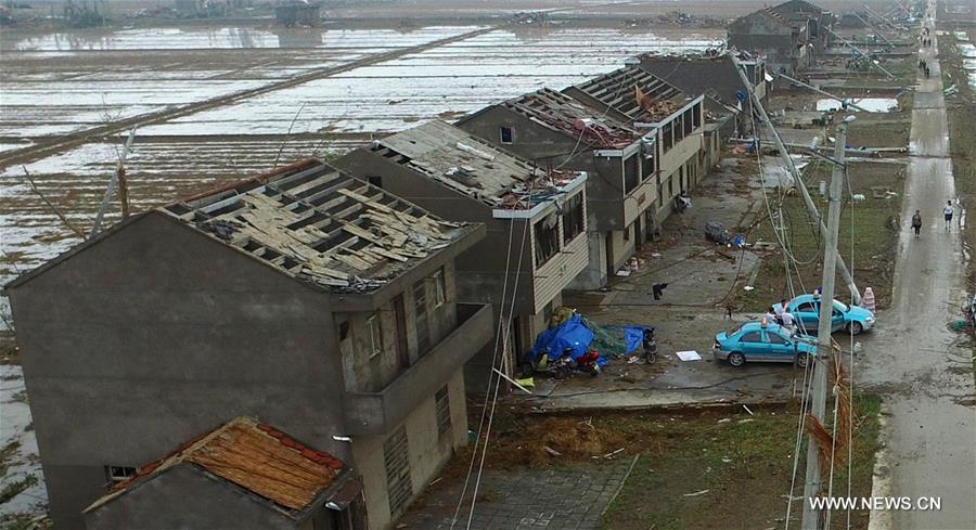 YANCHENG, June 24, 2016 (Xinhua) -- An aerial photo taken by a drone on June 24, 2016 shows damaged houses in Danping Village of Chenliang Township of Funing County in Yancheng City, east China's Jiangsu Province. Death toll of the tornado and hailstorms here has climbed to 98 by 10 a.m. on Friday. Intense downpours, hailstorms and a tornado battered parts of Yancheng City close to the eastern coast of China at 2:30 p.m. on Thursday, destroying buildings, trees, vehicles and electricity poles. (Xinhua/Han Yuqing)