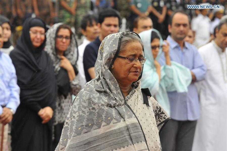 DHAKA, July 4, 2016 (Xinhua) -- Bangladeshi Prime Minister Sheikh Hasina pays tribute to victims during a memorial service for those killed in a bloody siege at the Army Stadium in Dhaka, Bangladesh, July 4, 2016. Nine Italians, seven Japanese, two Bangladeshis, a Bangladeshi-born U.S. citizen and an Indian female were killed in the attack on the Spanish restaurant in Dhaka popular with foreigners last week. (Xinhua/Shariful Islam)