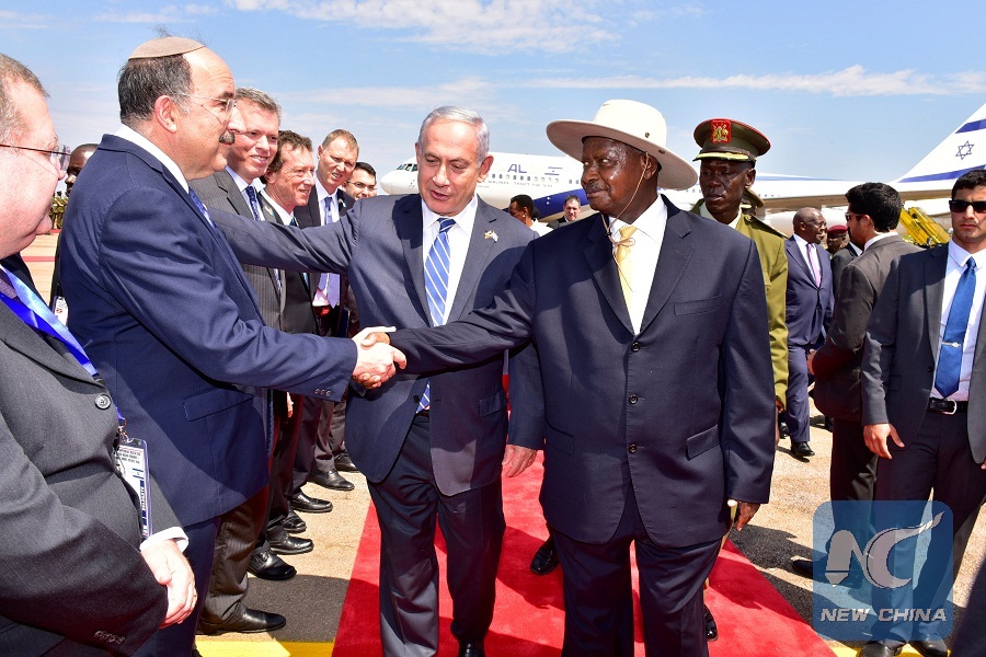 Israeli Prime Minister Benjamin Netanyahu (C) introduces members of his delegation to Uganda's President Yoweri Museveni after arriving to commemorate the 40th anniversary of Operation Entebbe at the Entebbe airport in Uganda, July 4, 2016. (Xinhua/Reuters Photo)