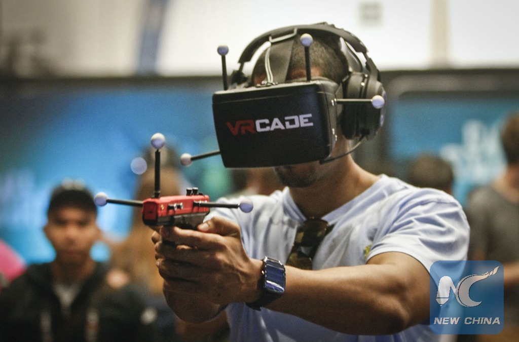 A visitor experiences a virtual reality shooting game at the virtual reality expo in Vancouver, Canada, May 14, 2016. The expo was the first of its kind held in Vancouver. (Xinhua/Liang Sen)