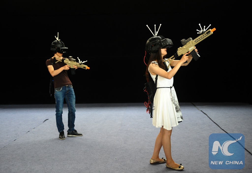 People experience a virtual reality game during the 12th China Changchun International Animation Art Fair in Changchun, capital of northeast China's Jilin Province, June 13, 2016. Virtual reality equipments in the theme of games and movies attracted many visitors at the fair. (Xinhua/Lin Hong)