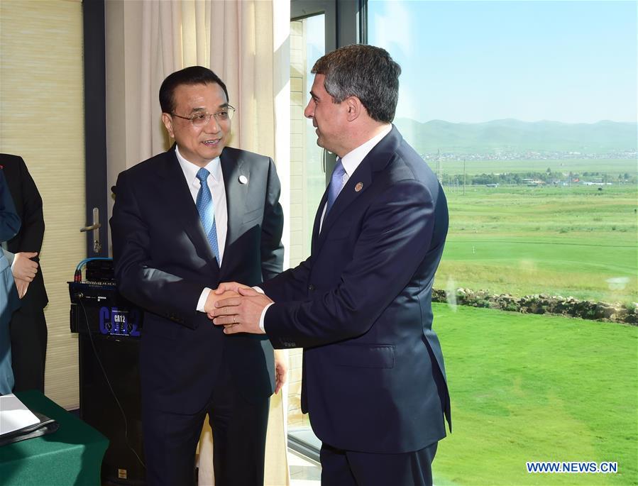 ULAN BATOR, July 16, 2016 (Xinhua) -- Chinese Premier Li Keqiang (L) meets with Bulgarian President Rosen Plevneliev in Ulan Bator, Mongolia, July 16, 2016. (Xinhua/Zhang Duo)
