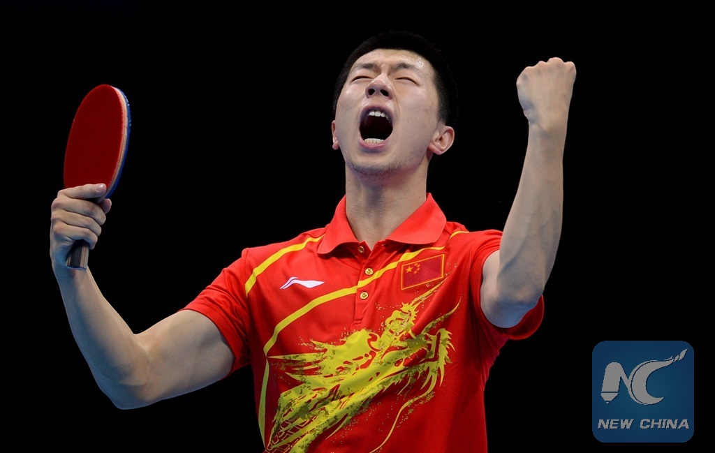 Ma Long of China celebrates during men's table tennis team final match between China and South Korea, at London 2012 Olympic Games in London, Britain, on August 8, 2012. China won gold medal. (Xinhua/Wang Qingqin)