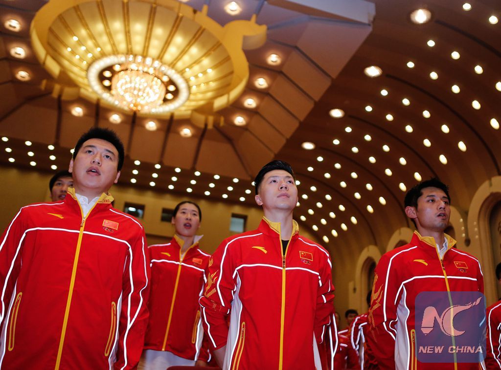 (L to R, front row ) Chinese shooting Olympic champion Pang Wei, table tennis Olympic champions Ma Long and Zhang Jike attend an official ceremony in Beijing, capital of China, July 18, 2016. (Xinhua/Zhang Chen)