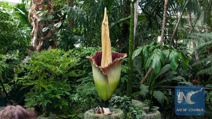 Amorphophallus titanum, also knwon as "corpse flower" blooms in New York Botanical Garden. (Xinhua Photo/Li Changxiang)