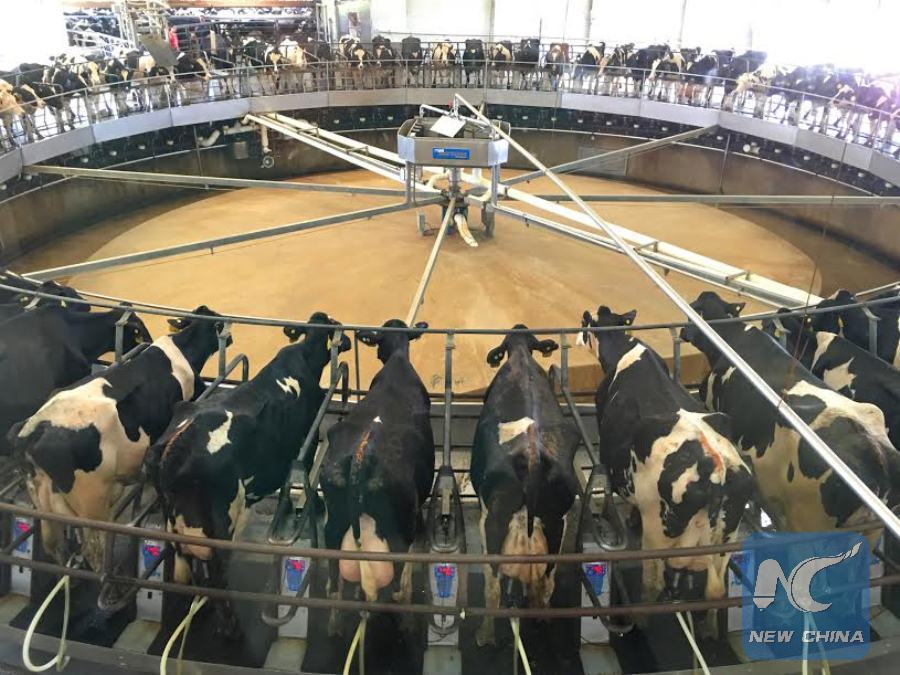 In the milking parlor, milked cows on the rotary machine. Mechanical pipes are placed under cows' udders, by which milk is extracted and collected, in Indiana, the United States, July 31, 2016. (Xinhua/Wang Ping)