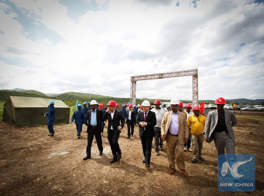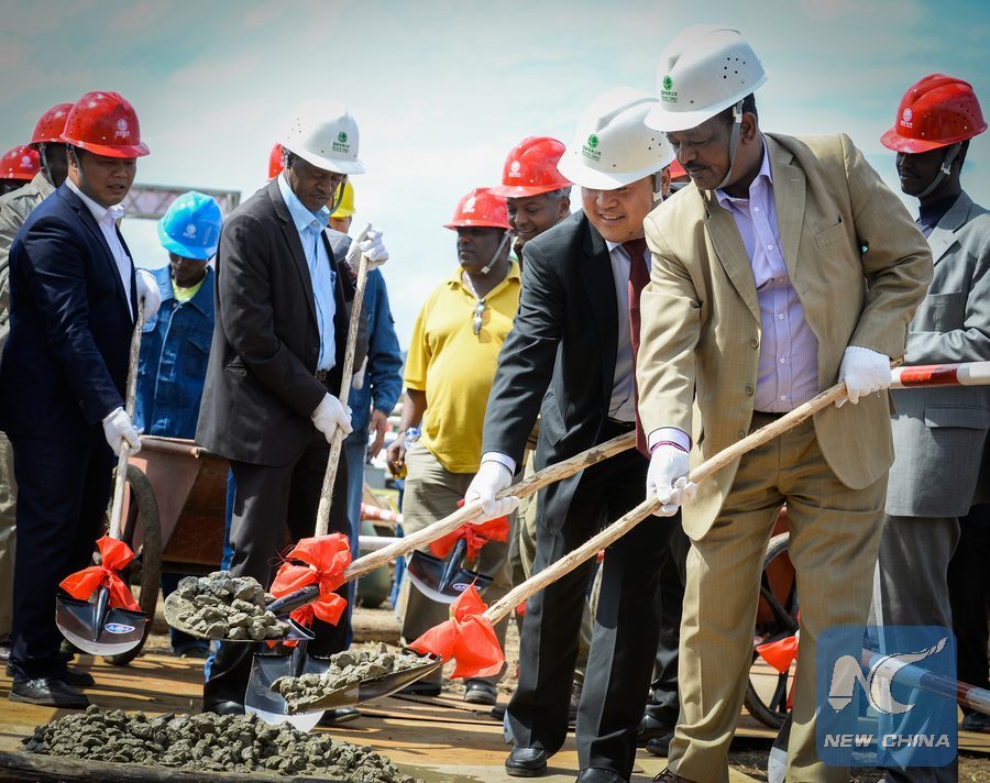 China Electric Power Equipment and Technology (CET) senior representative (2nd R) and Ethiopian Electric Power and Sub Station Projects Officer Reta Nigussie (1st R) take part in a commencement ceremony in Welayita Sodo Zone, Ethiopia, Aug. 1, 2016.(Xinhua/Michael Tewelde)