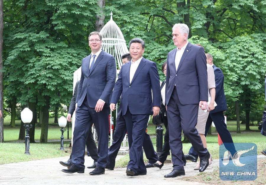 Chinese President Xi Jinping (C, front) attends a luncheon hosted by Serbian President Tomislav Nikolic (R, front) and Serbian Prime Minister Aleksandar Vucic (L, front) in Belgrade, Serbia, June 19, 2016. (Xinhua/Ding Lin)
