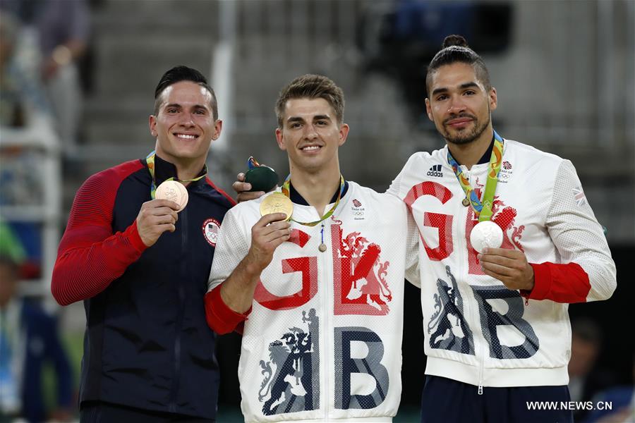 Max Whitlock (C) and Louis Smith (R) of Great Britain and Alexander Naddour of the United States attend the awarding ceremony of the men's pommel horse final of Artistic Gymnastics at the 2016 Rio Olympic Games in Rio de Janeiro, Brazil, on Aug. 14, 2016. Max Whitlock won the gold medal. (Xinhua/Shen Bohan)