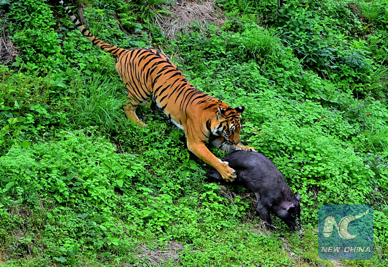 A tiger hunts a wild boar in the Meihua Mountain South China Tiger Breeding Research Center, Fujian. (Xinhua photo/Wei Peiquan)