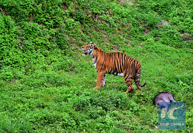 Xinhua reporters witnessed on Friday how well a tiger has mastered the skills when it caught a wild boar. After the boar was sent into the enclosure, the tiger ran after the prey, pounced on it, tussled with the struggling beast and bit it on the neck.