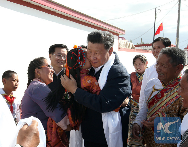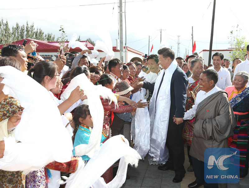 President Xi Jinping receives warm welcome from villagers in Changjiangyuan village in Golmud City, Qinghai Province, Aug. 22, 2016. (Xinhua/Pang Xinglei)