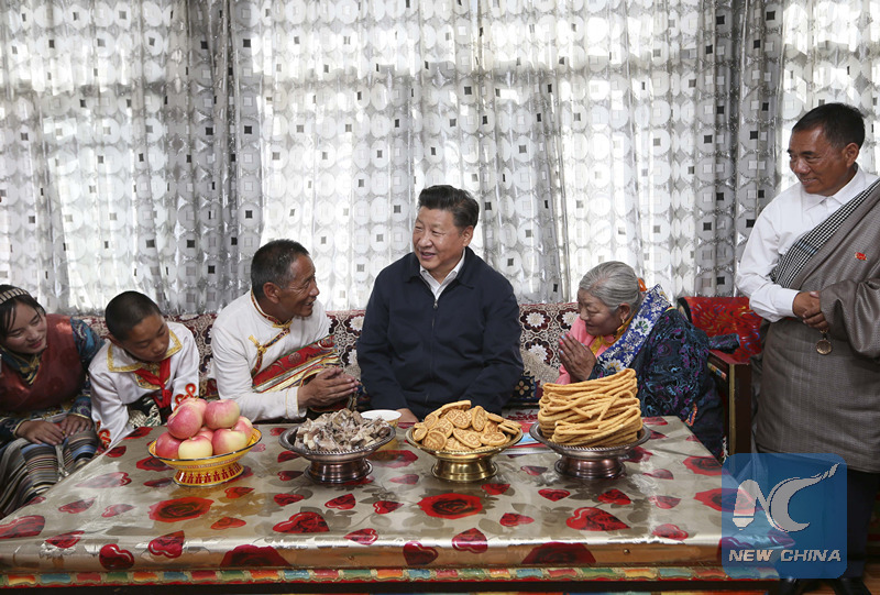 President Xi Jinping talks with Sengye, one of the villagers at his Tibetan-style sitting-room in Changjiangyuan village in Golmud City, Qinghai Province, Aug. 22, 2016. (Xinhua/Lan Hongguang)