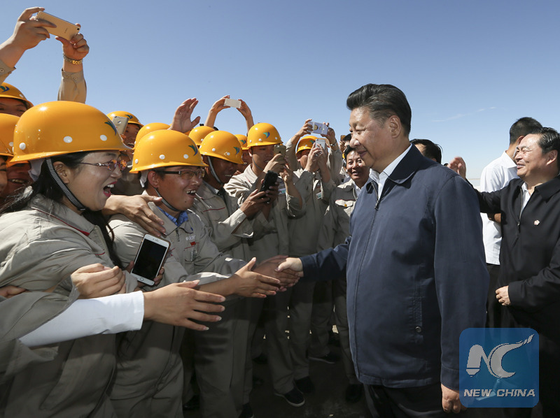 President Xi Jinping greets workers from Qinghai Salt Lake Potash Company Limited during his visit in Golmud City, Qinghai Province, Aug. 22, 2016. (Xinhua/Lan Hongguang)