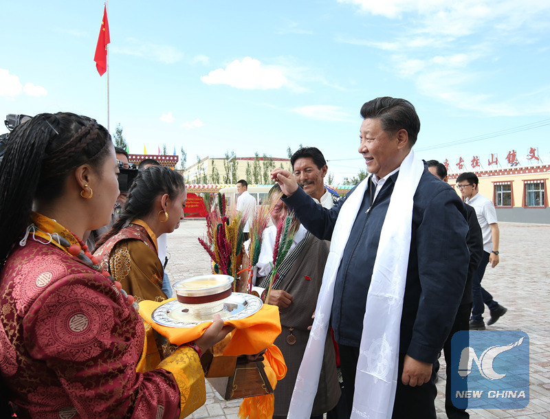 Chinese President Xi Jinping receives warm welcome from villagers in Golmud City, northwest China's Qinghai Province during inspection visit, Aug. 22, 2016. (Xinhua/Pang Xinglei)