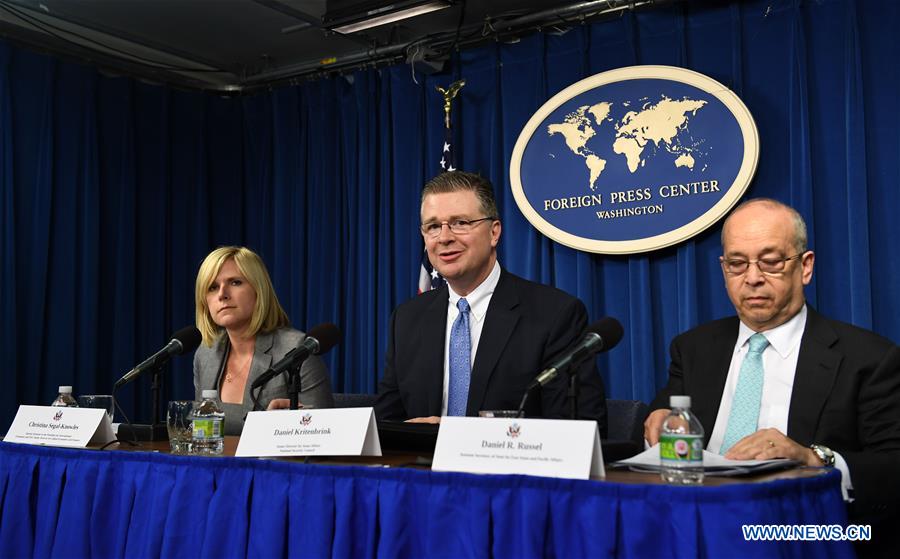 Daniel Kritenbrink (C), senior director for Asian affairs at the U.S. National Security Council, White House National Security Council adviser Christina Segal-Knowles (L), and Daniel Russel, U.S. assistant secretary of state for East Asian and Pacific affairs, attend a press briefing on preview of U.S. President Barack Obama's travel to China for the G20 summit, in Washington D.C. Aug. 30, 2016. The upcoming meeting between Chinese and U.S. leaders will focus on narrowing and managing differences, and expanding practical cooperation between the two countries, Daniel Kritenbrink told the press briefing. The G20 summit will be held in Hangzhou City, east China, on Sept. 4-5. (Xinhua/Yin Bogu)